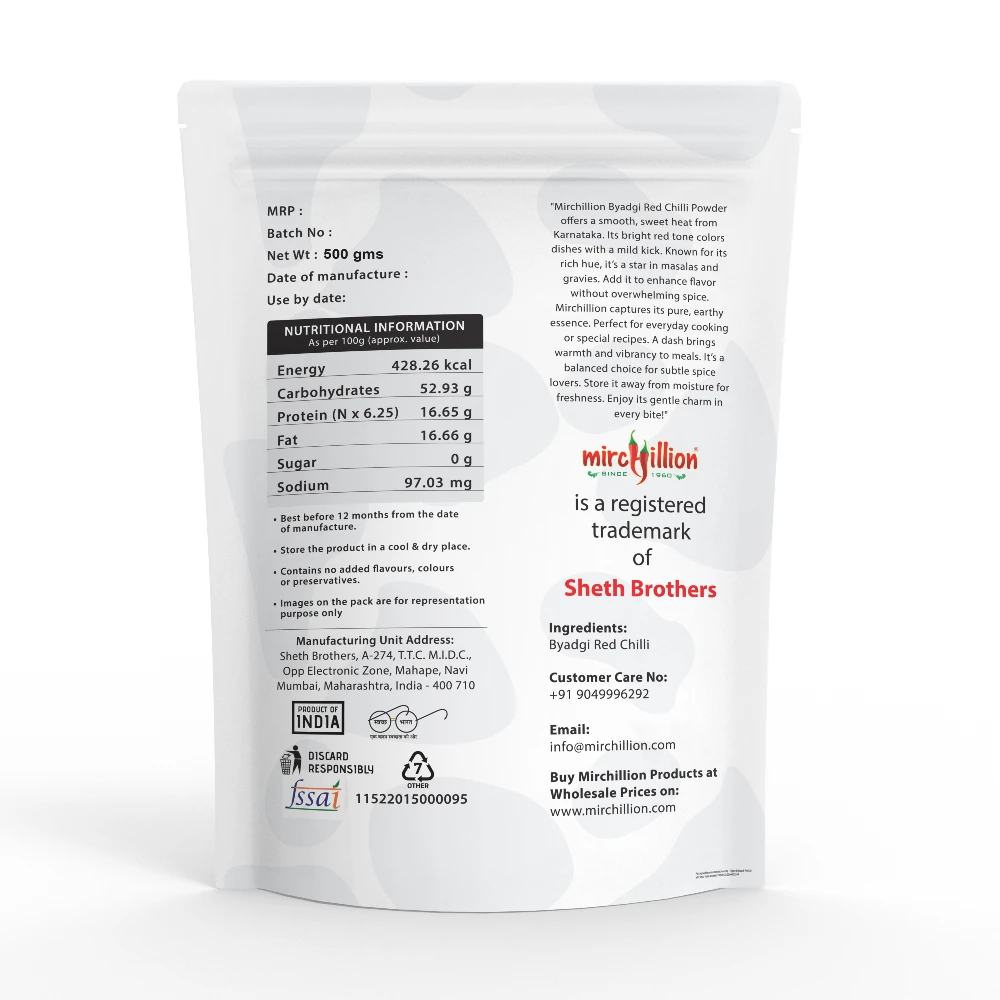 Mirchillion under the parent company Sheth Brothers, with its vast experience of over 63 YEARS in the field of Spices brings to you the world famous Byadgi Red Chilli Powder.It is prepared from the Red chillies procured from the Byadgi District in Karnataka in India.The Chilli powder has MEDIUM SPICYNESS and full of HIGH REDNESS and adds an amazing flavour to all your Indian and continental dishes.The product is 100% Natural.It has no preservatives,added flavours or any added colours.We highly recommend you to try this product and see your recipe come to life.