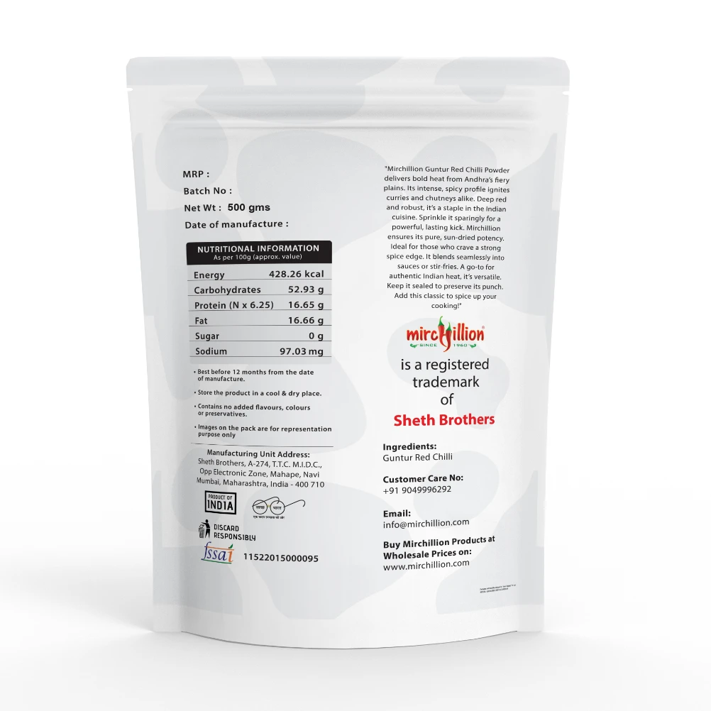 Mirchillion under the parent company Sheth Brothers, with its vast experience of over 63 years in the field of Spices brings to you the world famous Guntur Red Chilli Powder.It is prepared from the Red chillies procured from the Guntur District in Andhra Pradesh in India.The Chilli is very spicy and adds an amazing flavour to all your Indian and continental dishes.The product is 100% Natural.It has no preservatives,added flavours or any added colours.We highly recommend you to try this product and see your recipe come to life.