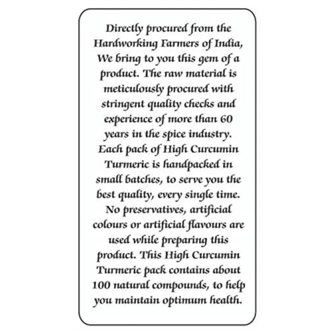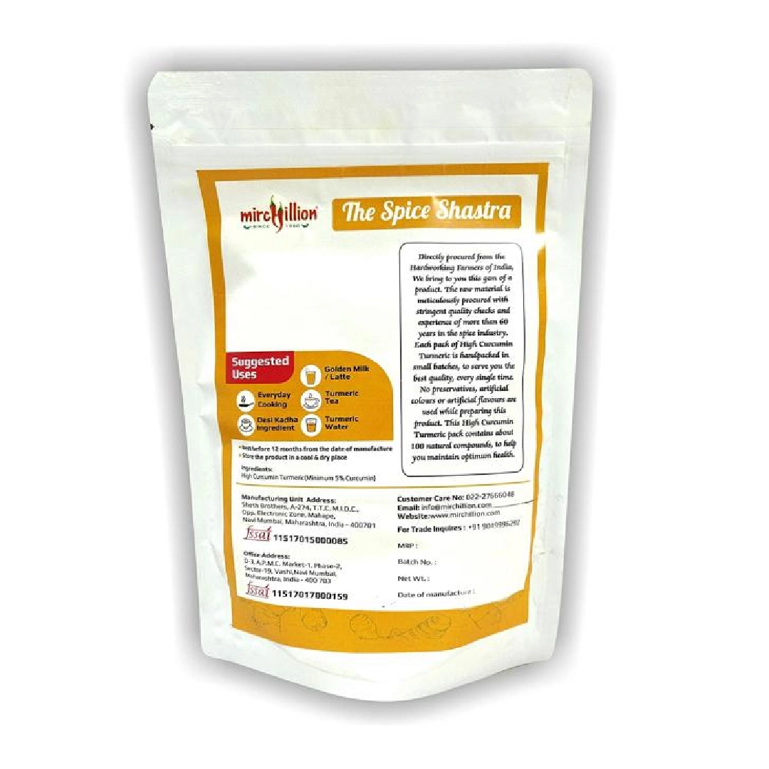 Directly procured from the hardworking farmers of india, we bring to you this gem of a product. The raw material is meticulously procured with stringent quality checks and experience of more than 60 years in the spice industry. Each pack of mirchillion high curcumin turmeric is handpacked in small batches, to serve you the best quality, every single time. No preservatives, artificial colours or artificial flavours are used while preparing this product. This high curcumin turmeric pack contains more than 100 natural compounds to help you maintain optimum health. Get your pack of high curcumin turmeric now